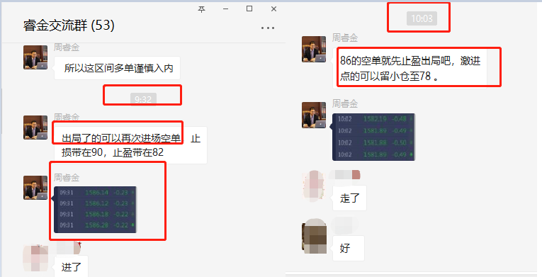 早间周睿金交流群中给出的1589附近空单,稳健者已经有部分在1583附近落袋为安,屏幕前的你有跟上吗?周评中周睿金就强调了,本周会有技术回补的空间,早间开盘虽上冲1593一线,但是回落的速度也特别快,所以果断在1589提示空单进场,稳健者在1583落袋为安。黄金反弹1586一线周睿金果断再次给出空单进场提示,再次成功止盈,日内两单空均完美获利落幕。这段时间前来咨询周睿金分析师团队的朋友实在太多太多了,首先在这里感谢各位的认可。奈何疫情当前,无法回到工作室,只能蜗居家里办公。所以消息回复上有时候并无法那么及时,毕竟周睿金要以已经建立合作的实仓客户优先,优先回答他们的问题,给予技术上的讲解。
