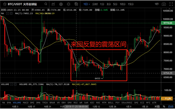 去年的小阳春开始于2019年的4月2号,大饼从低点4140刀完全突破压力位5000刀,之后站稳5000刀,并且在5月7日突破掉6000刀正式开启大趋势确定上涨的行情,但是就是这个大趋势确定向上的行情,依旧伴随着5月16到5月18,5月20日到5月22日,5月28日到6月6日的三次小幅回踩,6月27日到7月2日的大幅度插针回踩,之后进入震荡阶段性逃顶区间。