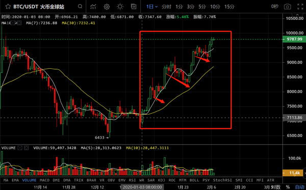 图中红色框框中是比特币到目前为止的整个上涨过程,我是在大饼从1月3日大幅反弹之后连续三日上涨确定调大趋势大概率向上了的,这个期间大饼连续上攻了5日之后出现回踩修整,回踩支撑位高于第三波上攻新高,说明筑基成功,之后又是大幅拉升式上攻,之后再度回踩,之后连续三日大幅拉升式上攻,紧接着又是震荡回踩,就到现在了也是连续前面连日大幅拉升式上攻了,假设今天继续上攻就是三天了,从前面的币价历史走势来看,假设今天在大幅拉升式上攻,预判大概率会有回踩修整,所以今天大饼的操作就不建议大家去追拉升高位的操作了。还有就是我本身是不做合约的,但是很多币友由于各种原因参与了,之前我也对很多我了解的学员说过,在大趋势确定的情况下,3.1—5倍小杠杆做顺势合约是可以的,所以目前的这种情况就是建议合约的可以保住利润先止盈了,现货的我还是那句话,有的拿住等到这波拉升过万去看,还有空仓仓位的币友可以考虑等待这波上攻之后看是否开启回踩在做操作决定。