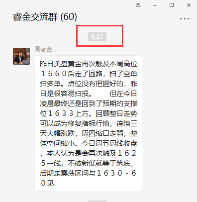 昨日美盘黄金再次触及本周高位1660后走了回路,扫了空单扫多单。点位没有把握好的,昨日是很容易扫损。 但在今日凌晨最终还是回到了预期的支撑位1633上方。回顾整日走势可以成为修复指标行情,连续三天大幅涨跌,周四缩口走弱,整体空间缩小。今日周五周线收盘,本人认为是会再次触及1625一线,不破新低就等于筑底,后期走震荡区间与1630-60见!(实盘指导中早盘已经在1645干空,46-48加仓空了,此单在新浪微博同步更新的有,文章有延时,想参考现价单可关注周睿金新浪微博)
