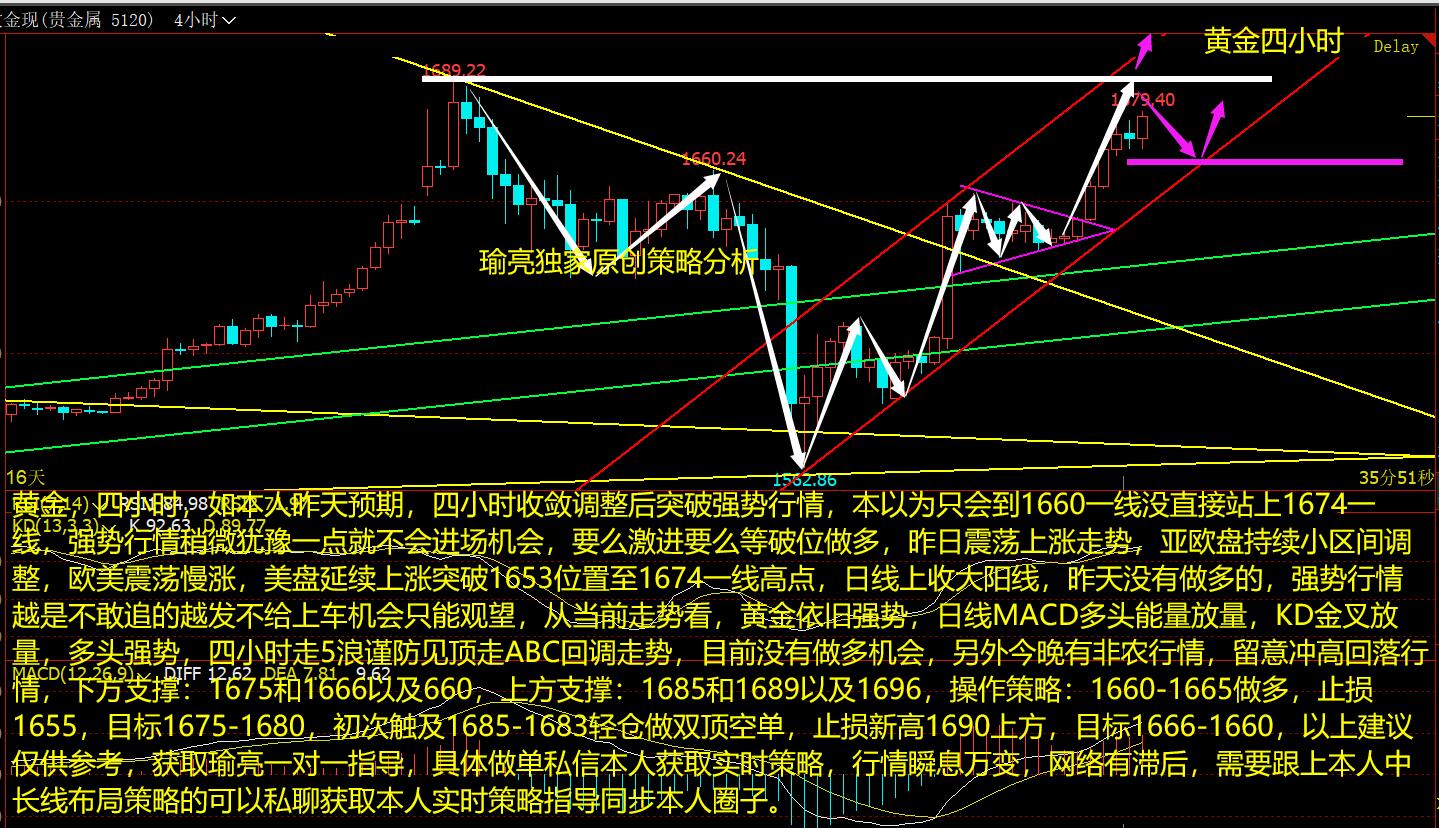黄金,四小时,如本人昨天预期,四小时收敛调整后突破强势行情,本以为只会到1660一线没直接站上1674一线,强势行情稍微犹豫一点就不会进场机会,要么激进要么等破位做多,昨日震荡上涨走势,亚欧盘持续小区间调整,欧美震荡慢涨,美盘延续上涨突破1653位置至1674一线高点,日线上收大阳线,昨天没有做多的,强势行情越是不敢追的越发不给上车机会只能观望,从当前走势看,黄金依旧强势,日线MACD多头能量放量,KD金叉放量,多头强势,四小时走5浪谨防见顶走ABC回调走势,目前没有做多机会,另外今晚有非农行情,留意冲高回落行情,下方支撑:1675和1666以及660,上方支撑:1685和1689以及1696,操作策略:1660-1665做多,止损1655,目标1675-1680,初次触及1685-1683轻仓做双顶空单,止损新高1690上方,目标1666-1660,以上建议仅供参考,获取瑜亮一对一指导,具体做单私信本人获取实时策略,行情瞬息万变,网络有滞后,需要跟上本人中长线布局策略的可以私聊获取本人实时策略指导同步本人圈子。
