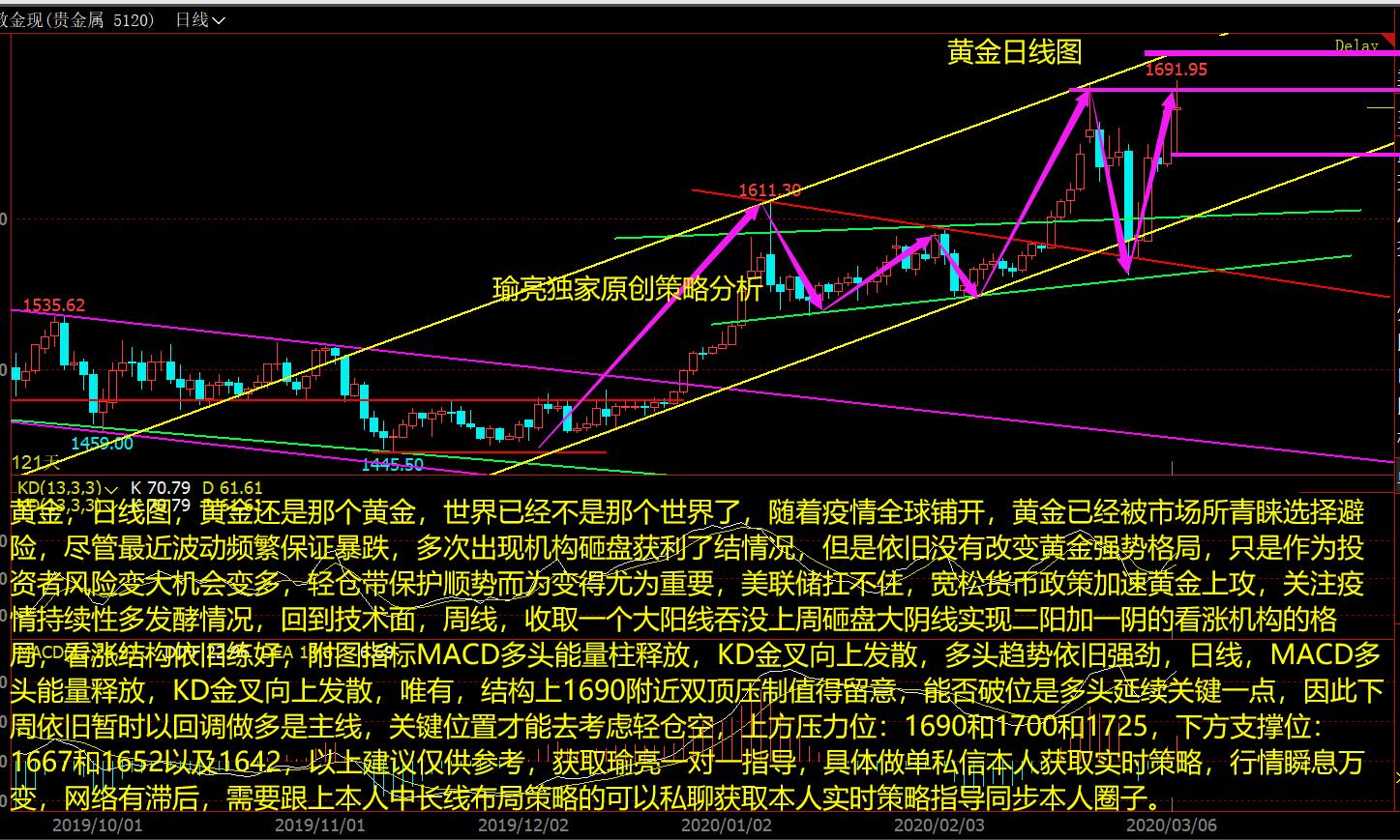 黄金,日线图,黄金还是那个黄金,世界已经不是那个世界了,随着疫情全球铺开,黄金已经被市场所青睐选择避险,尽管最近波动频繁保证暴跌,多次出现机构砸盘获利了结情况,但是依旧没有改变黄金强势格局,只是作为投资者风险变大机会变多,轻仓带保护顺势而为变得尤为重要,美联储扛不住,宽松货币政策加速黄金上攻,关注疫情持续性多发酵情况,回到技术面,周线,收取一个大阳线吞没上周砸盘大阴线实现二阳加一阴的看涨机构的格局,看涨结构依旧练好,附图指标MACD多头能量柱释放,KD金叉向上发散,多头趋势依旧强劲,日线,MACD多头能量释放,KD金叉向上发散,唯有,结构上1690附近双顶压制值得留意,能否破位是多头延续关键一点,因此下周依旧暂时以回调做多是主线,关键位置才能去考虑轻仓空,上方压力位:1690和1700和1725,下方支撑位:1667和1652以及1642,以上建议仅供参考,获取瑜亮一对一指导,具体做单私信本人获取实时策略,行情瞬息万变,网络有滞后,需要跟上本人中长线布局策略的可以私聊获取本人实时策略指导同步本人圈子。