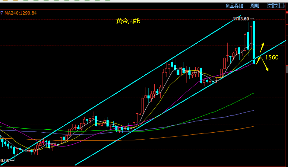 #黄金周评# 本周一跳空拉升至1704近期以来高点,但最终未站稳,重新下破1690双顶阻力,这个走法就暗示金价或展开大幅度区间的反复运行,尤其是周一破位1690后接连下破1680支撑,故周初就开始强调黄金存在一波大幅跳水,以波段做空之法不断下空,加仓空,一度抵达预期1596、1585两个目标,斩获有史以来一周的暴利,周五早间急跌至1550周线上行通道下轨支撑后,反抽破了开跌口1584-85,故认为本周这一波的下跌有望结束,会底部震荡修正,给出1580-82波段开始反手多,途中1584-85加仓多,美盘抵达1597-98提示盈利,这一路都比较顺利成功,夜间未触及1610风水岭压力后,冲高回测,以周五涨幅回落的618分割位置再一次布局多单,1571-72多,但比较惋惜,只拉升1582,没留意盯盘,10美金利润错失反而下滑破位1560扫损离场,半夜的继续下挫至1504的举动让笔者超乎想象,打破了本周原本的底线,但整体累计的利润是比较丰厚的:接下来下周黄金是否走弱?1500能否坚守?下面就详细来解读下: 第一,老规矩,长线看月线级别,上月触及1590大幅冲高走跌,整体还是依托5均线走强中,本月触及1704再次出现大幅回落,且首次靠拢了关键10均线支撑1500一线,此位置对于下周尤为的关键,因为一般来讲周期10均线得失是强弱的拐点,一旦本月收盘于1500下方,意味着4月份开始金价整体会一定程度走弱震荡延续下跌,再按照2008年历史循环走法,有可能还要持续两三个月,刺破22日中轨均线后逼近1380支撑逢低才会有效企稳,迎来后市进一步的避险多头上涨;当月能守住1500关口,整体还不会太差,会维持1600-1500区间做一个整理过程,因此,月线级别重点关注1500得失; 第二,中期周线级别,原本周初判断是高位大阳大阴宽幅来回洗盘整理运行,但周五尾盘的进一步跳水打破了这句局面,因为收盘失守上行通道下轨支撑,下周反弹确认的压力就是1560,要关注下周周线的收盘位置,处于1560下方,则下下周继续延续下跌,而处于1560上方较远,则存在刺破,下下周延续上涨,而想要金价重新回到偏强运行的话,必须重新突破站上周线短期均线1600,也是周五的开跌口附近,目前来看有难度,因此周线我们关注下周1560收盘得失即可,暂时中期即将以走弱来看待;第三,短期日线级别,本周五连阴,已经有小单边的味道,连接破位三道趋势支撑,触及第四道1505后有所支撑表现,下周则关注1505-1580,第四和第三上下通道内的运行得失,短线目前已经走弱,反弹空为主跟随,一旦破位1500关口,会引发再度的大幅度跳水;第四,最后小时线级别,凌晨压力1536-38是下周一首要的压制点,短期支撑1510,按照618分割看,强压是1562和1576,从波段思路,触及强压可以分批继续空为主,看1500得失,破位了就继续波段空下去即可;若价格重新回到1576-1580上方,则意味着杀跌跳水结束,回到避险上涨中,再去转变思路看回测波段上涨;另外周一早间先回测可以1500作为防守,1510逢低试探多,毕竟是关键支撑,而且从2月份和3月份这两次大幅杀跌时间看,集中周尾发生;