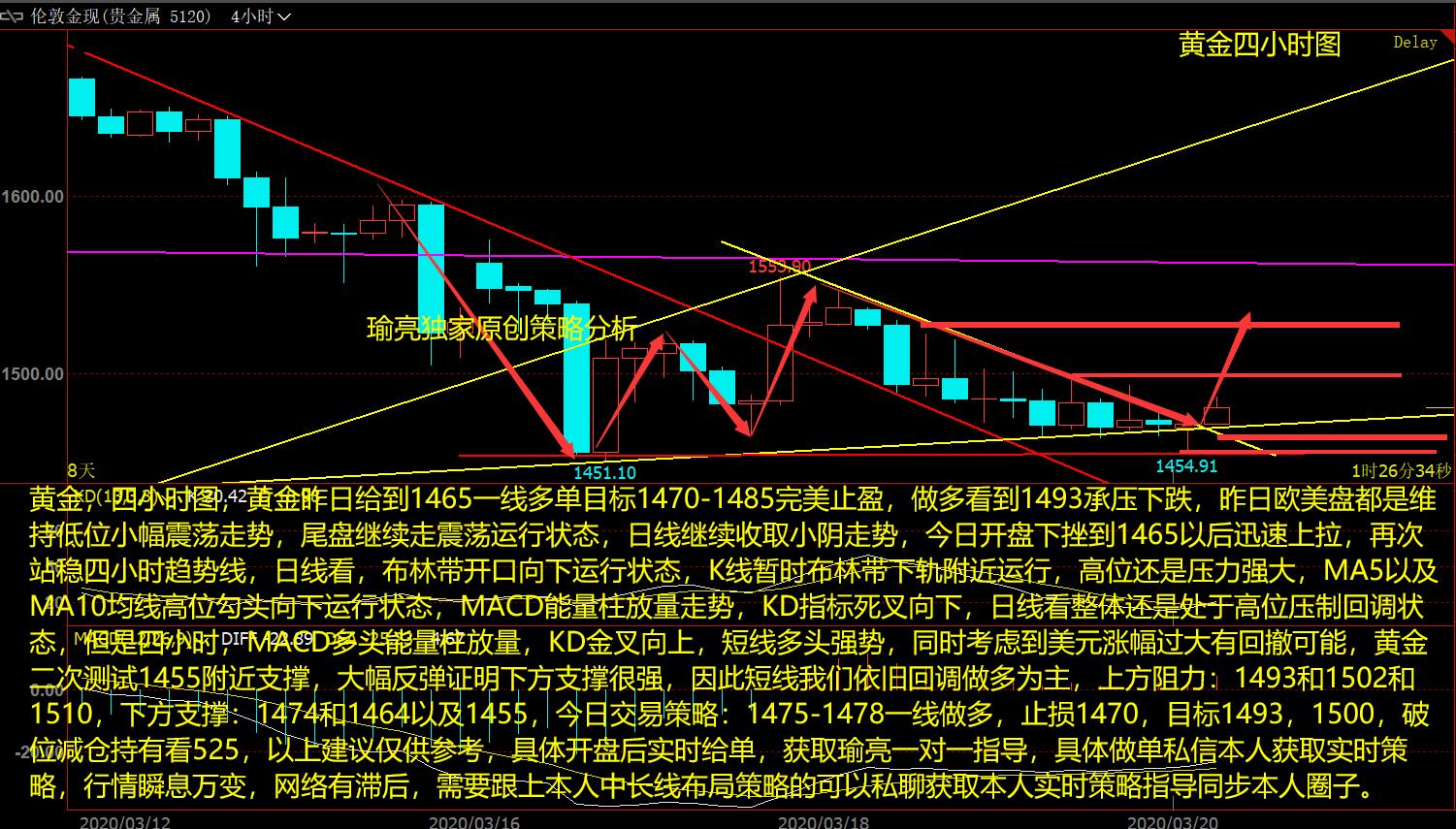 黄金,四小时图,黄金昨日给到1465一线多单目标1470-1485完美止盈,做多看到1493承压下跌,昨日欧美盘都是维持低位小幅震荡走势,尾盘继续走震荡运行状态,日线继续收取小阴走势,今日开盘下挫到1465以后迅速上拉,再次站稳四小时趋势线,日线看,布林带开口向下运行状态,K线暂时布林带下轨附近运行,高位还是压力强大,MA5以及MA10均线高位勾头向下运行状态,MACD能量柱放量走势,KD指标死叉向下,日线看整体还是处于高位压制回调状态,但是四小时,MACD多头能量柱放量,KD金叉向上,短线多头强势,同时考虑到美元涨幅过大有回撤可能,黄金二次测试1455附近支撑,大幅反弹证明下方支撑很强,因此短线我们依旧回调做多为主,上方阻力:1493和1502和1510,下方支撑:1474和1464以及1455,今日交易策略:1475-1478一线做多,止损1470,目标1493,1500,破位减仓持有看525,以上建议仅供参考,具体开盘后实时给单,获取瑜亮一对一指导,具体做单私信本人获取实时策略,行情瞬息万变,网络有滞后,需要跟上本人中长线布局策略的可以私聊获取本人实时策略指导同步本人圈子。