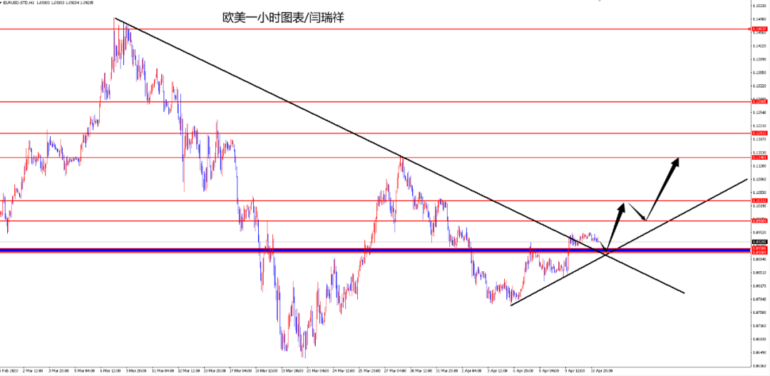 欧美方面,欧美上周五价格呈现震荡的状态,当日价格最低于1.0917位置,最高上涨至1.0952位置,收盘于1.0930位置。欧美方面我们本次从最低点1.0790-1.0800区间开始全力布局多,中间几次的加仓多如期上涨,波段的多头也是大幅获利中。周线级别看欧美大阳,目前看欧美的多头还将继续拉升,价格短线回撤后我们仍需继续布局多,下方重点关注1.0900-10区间支撑,从下方图表中可以明确看出此位置是价格突破下跌趋势线回踩入场的区域,另外也是目前短线上涨趋势线下边缘位置,价格回踩此区域直接多即可,继续看欧美新一波的拉升。