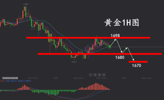 黄金结合小时图走势,日内上方重点还是关注1700-03压制,只要不回到1700上方站稳,则短线行情大概率还是会再有一波回撤调整的。下方则关注1673-70支撑继续震荡,如果日内行情一直处于1690以下震荡,则短期内行情破位1670的概率会有加速可能,届时下方可着重关注1660、1650附近支撑测试。