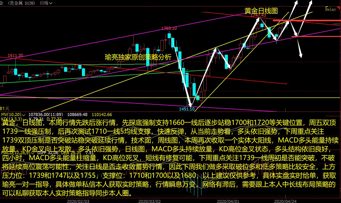 黄金,日线图,本周行情先跌后涨行情,先探底强制支持1660一线后逐步站稳1700和1720等关键位置,周五双顶1739一线强压制,后再次测试1710一线5均线支撑,快速反弹,从当前走势看,多头依旧强势,下周重点关注1739双顶压制是否突破站稳突破延续行情,技术面,周线图,本周再次收取一个实体大阳线,MACD多头能量持续放量,KD金叉向上发散,多头依旧强势,日线图,MACD多头持续放量,KD高位金叉状态,多头结构依旧良好,四小时,MACD多头能量柱缩量,KD高位死叉,短线有修复可能,下周重点关注1739一线周初是否能突破,不破将延续高位震荡可能性,关注日线是否走收敛蓄势行情,因此下周我们做多采取破位多和低多策略比较安全,上方压力位:1739和1747以及1755,支撑位:1710和1700以及1680,以上建议仅供参考,具体实盘实时给单,获取瑜亮一对一指导,具体做单私信本人获取实时策略,行情瞬息万变,网络有滞后,需要跟上本人中长线布局策略的可以私聊获取本人实时策略指导同步本人圈。
