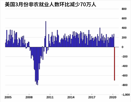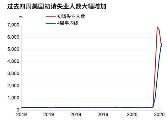 根据美国劳工部公布的数据,自3月下旬以来,美国当周初请失业金人数大幅飙升,过去四周美国首次申领失业救济总人数已经超过2200万人。4月初公布的美国3月份非农就业人数由2月份的增加27.3万人降为-70万人,失业率由3.5升至4.4%。作为经济的领先指标,美国劳动力市场数据持续表现不佳,暗示美国经济陷入衰退的风险急剧增加。除了劳动力市场表现低迷外,美国3月份零售销售月率由-0.5%降至-8.7%,由于消费对美国GDP的贡献度在70%,消费萎缩再度增添了市场对美国经济陷入大衰退的担忧。