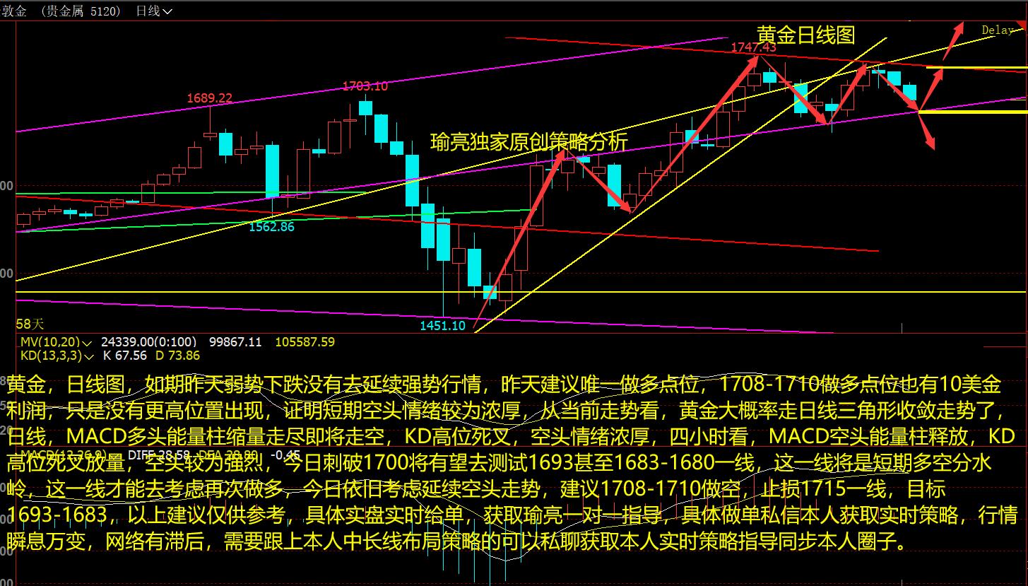 黄金,日线图,如期昨天弱势下跌没有去延续强势行情,昨天建议唯一做多点位,1708-1710做多点位也有10美金利润,只是没有更高位置出现,证明短期空头情绪较为浓厚,从当前走势看,黄金大概率走日线三角形收敛走势了,日线,MACD多头能量柱缩量走尽即将走空,KD高位死叉,空头情绪浓厚,四小时看,MACD空头能量柱释放,KD高位死叉放量,空头较为强烈,今日刺破1700将有望去测试1693甚至1683-1680一线,这一线将是短期多空分水岭,这一线才能去考虑再次做多,今日依旧考虑延续空头走势,建议1708-1710做空,止损1715一线,目标1693-1683,以上建议仅供参考,具体实盘实时给单,获取瑜亮一对一指导,具体做单私信本人获取实时策略,行情瞬息万变,网络有滞后,需要跟上本人中长线布局策略的可以私聊获取本人实时策略指导同步本人圈子。