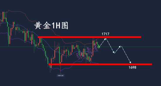 昨日黄金再次维持1696-1715区域内震荡,行情依然反复没有方向,虽然行情进行一波强势拉升,但是最终还是维持在区间内运行,并没有破位,均线夹层区间越来越窄,这给短线行情走势的预判带来很大的难度,此形态可跌可涨,但结合前期回修行情整体居高震荡且上方存在趋势线压制的情况,还是倾向于回修的比重大一些。