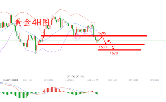 昨日黄金先震荡冲高再测1720一线附近,随后如预期展开回修调整,晚间时段破位1700、1690支撑,下方一度回撤至1680附近,且其后也一直位于低位震荡,日线收得一实体饱和中阴线,贯穿跌破短周期均线带。