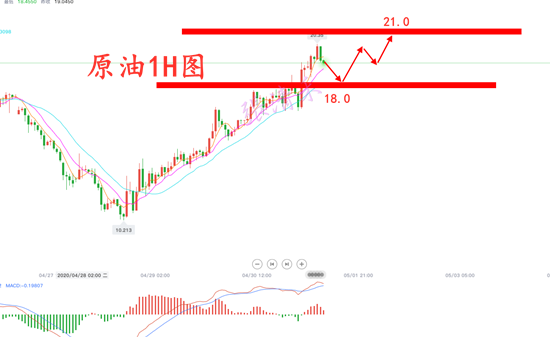 美油隔日的行情最终突破前期反弹压力,跌势完全改变,日线级别筑底成功,接下里原油预计是继续震荡上行的走势,虽然在20.5区域上下会存在压力,但是行情最终会重新回到20-30区域内进行震荡。