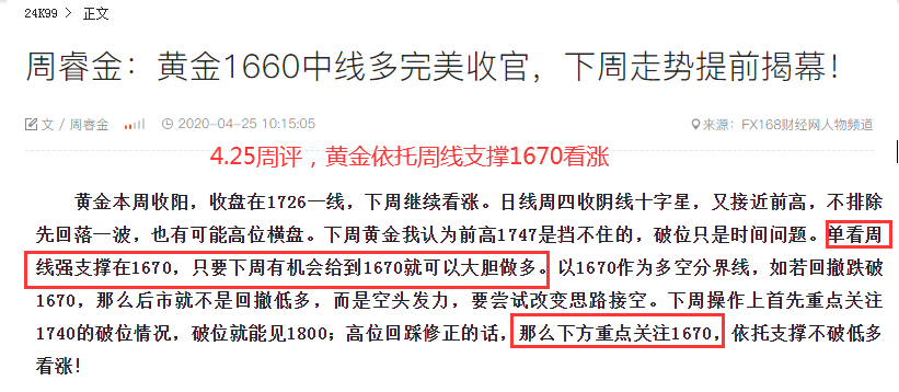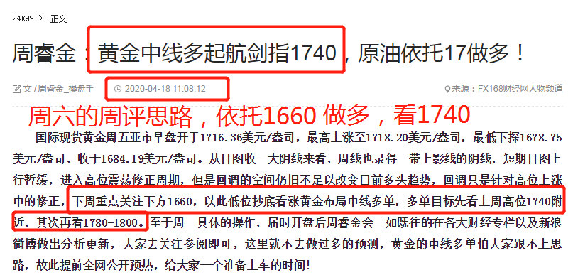 黄金早在4.18号周评中周睿金团队坚定看涨,从1660中线多布局到1740,上周4.25周评中再次给出关键支撑为1670,回踩依托1670看涨,周五美盘最低回踩1670.15走反弹,周线收官在1699.92一线,至此在周睿金团队看来,黄金为期一周的震荡修复告一段落,黄金从4.18号的1660反弹到1740,又从1740回落到1670,再次从1670修正反抽到1700,那么这绝对不是抄顶的时机,更不意味着下周继续回落,空头一泻千里。反而这是多头蓄势发力的时候到了,强烈的多头反攻即将开始,届时一切的空头都是纸老虎,黄金下周必将站上1700,从而突破高位1740,冲刺1780-1800,下周思路回踩低多即可,回落就是多头上车的机会。下方依托前期的低点1670-1660低多看涨,中线多单可以直接拿到1780-1800。短线操作上的布局,届时周一再与大家详谈,周评只能给出下周的一个大的做单方向!