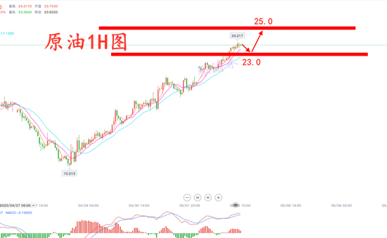 美油随着欧佩克+减产协议正式施行,以及欧美将开始恢复经济,原油的供应过剩的现况得到一定的改善,对油价起到支持作用。原油震荡走高,连续五个交易日上扬。成功站上22美元上方运行。