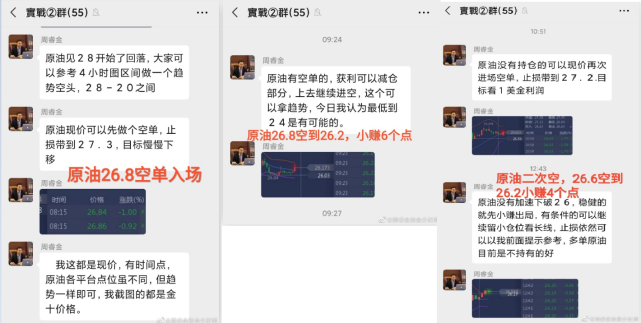 黄金周睿金本周的思路一直是低多看涨不变,奈何行情墨迹震荡修复,好在昨天周二的操作中,两次在1695多单入场,均收获满满,今日的思路依旧低多为主,给出的多单点位1695-98-1700-03,手上有跟还上这些多单的朋友继续耐心持有即可,坐等晚间小非农助涨起飞。原油在线下实仓指导中,周睿金团队已经给出两单空单,早间08:15分给出26.8现价空入场,空单在北京时间09:23分于26.2止盈离场,小赚6美金;第二单空单在北京时间10:50分油价26.6入场空,空单于北京时间12:42分在26.2小赚4美金离场。震荡行情稳健为主,利润见好就收!