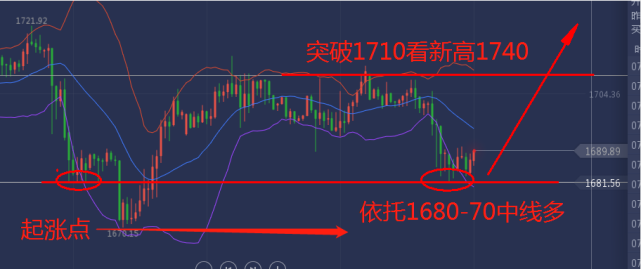 黄金昨日线下指导中没有给出单子,反而原油给了4连空,最终收获38美金的利润,交了一份满意答卷。黄金昨日小非农数据利多不涨,行情最终再次下行测试1680区域支撑,其中不少人认为行情转跌,实际上还是震荡走势没有改变,而且1685区域的支撑大概率是黄金波段上涨的起涨点,将是突破当前盘整平台的起跳点,干多,激进者1690附近毫不犹豫的直接多!不得不说,黄金当前的区间震荡走势,行情反复,无规律的波动加大了我们的操作难度,但是在趋势面前,一切终将是过眼云烟,甚至回头看只是一个小波澜!当前黄金已经调整至震荡尾部,下方受到日线布林下轨的支撑,昨日行情回落后快速拉升,1680区域将会成为本次调整的重要支撑,也是行情再次上涨的跳板!