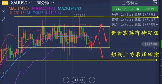 1、昨日黄金震荡回弹,上方测压1753一线,未出现有效突破,也未出现明显的承压回落,不过持续的震荡攀爬,使得小时图级别面临的承压回修风险也有所加强,接下来上方重点关注1753/55短压带测试,如果行情能够站上1755上方,则短线走势将再度走强,上方必将继续测试前高1765一线!而下方一旦再次下破1740,则行情将继续展开二次回落,下方将再次测试支撑1730/25,甚至1700;