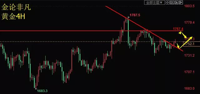 黄金四小时3点连成的趋势线突破,今日等待回踩多单介入,上方同时也给出压制,操作方面耐心等待点位。做单好比打猎,没有耐心哪有大猎物,小猫2只没意思搞不好还白白放空枪。下方点位支撑看1742-1745,上方压制1767。