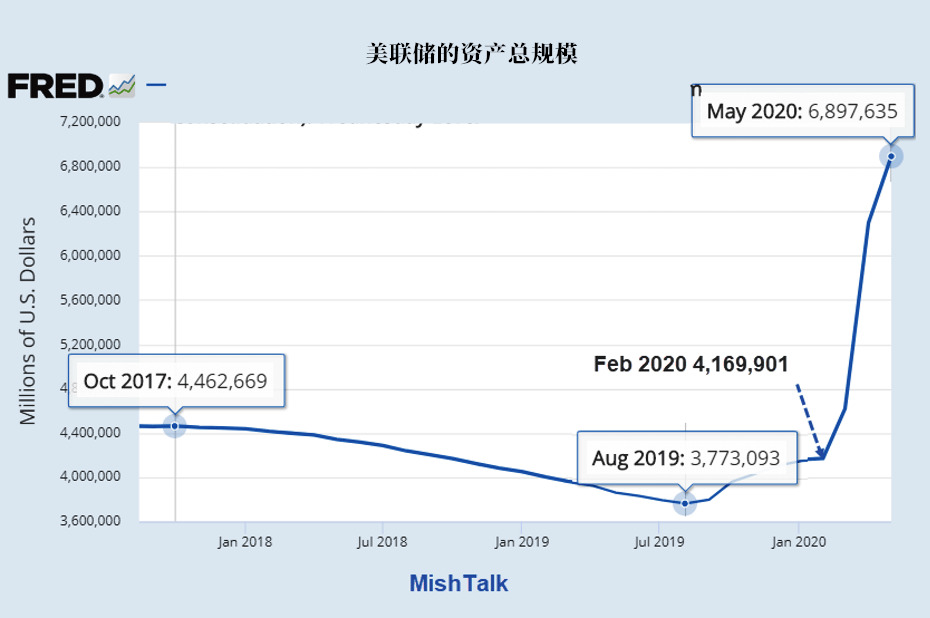 有数据显示,2019年10月到5月20日,美联储资产负债表规模从4万亿美元迅速膨胀,几乎翻倍。