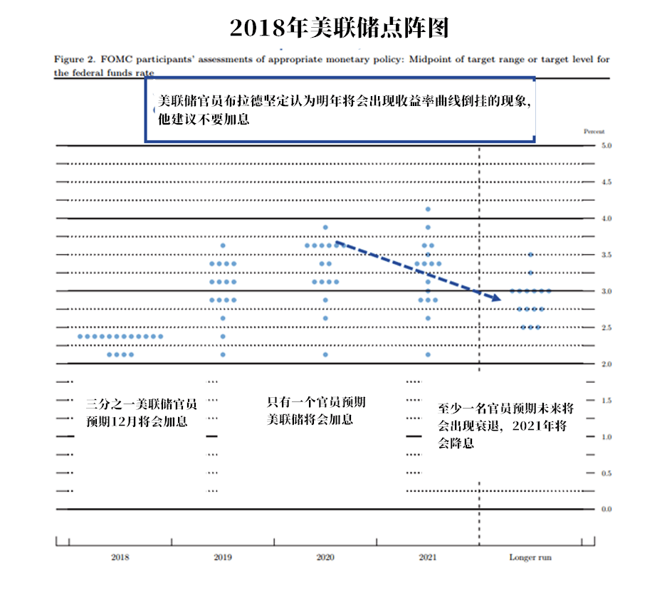从2018年9月美联储公布的点阵图可以看到,美联储官员对未来3年的经济预期一直在下降。在鹰派预期还十分强烈的时候,布拉德还警告明年将会出现收益率曲线倒挂的现象,而这在后来被成功验证了。