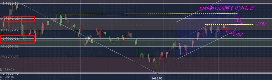 4小时的随机指和MACD指标是死叉向下的,调整分为下跌调整,回踩确认支撑和横盘抗跌,有回撤需求,暂时不会有强势的单边出现。支撑位置1732一线,压力位置1745一线,日内按照1732-1745的区间来处理。