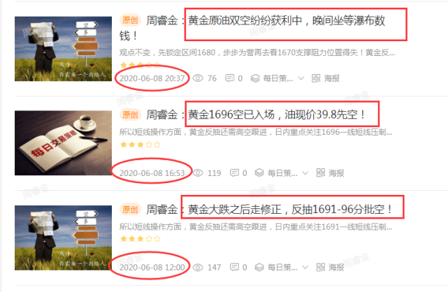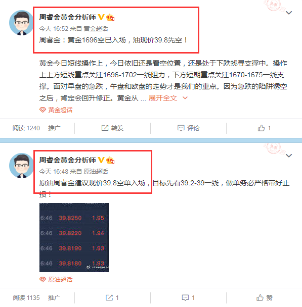 以上就是今日周睿金团队这边黄金原油的操作情况,这些单子思路均在全网各大财经专栏,新浪微博中实时公开,这就是周睿金分析师团队的态度,立足于市场多年,始终坚持站在行业最顶端,用最高调的方式,最直白的文字,最直接的利润出现在大家面前。只要关注我的朋友应该都知道,实实在在做分析,清楚的操作思路,明确的进场点位,如果你认可我的分析,跟上操作就能收割利润。现在这个市场鱼龙混杂,模棱两可的分析有很多,但真正实用的却很少,更多的是赚了出来吹牛,亏了不敢承认。如果你觉得眼花缭乱,那么看这里就够了,你想要的这里都有!