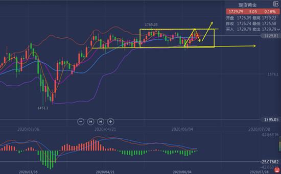 市场方面(黄金暴涨暴跌):周四(6月11日)美市盘中,国际现货黄金上扬,因受美联储黯淡经济前景和继续挹注支撑的承诺支撑,而股市则因市场对第二疫情的到来担忧而下滑。其中在美市盘中,国际现货黄金价格走出倒V反转,在触及6月2日以来最高水平1744.59美元之后很快冲高回落,盘中短线直接下挫逾18美元,至1726.10美元。同时,现货白银日内跌超2.2%,现报17.624美元。