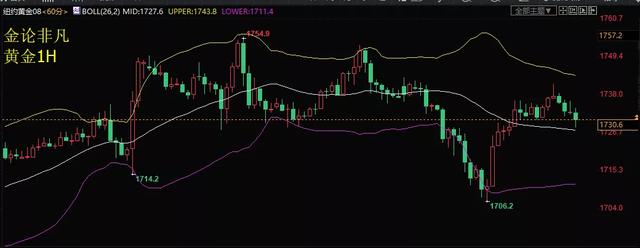 黄金1710做多,目前看就是最低点,收获60个点,目前看也是错过头部利润。持有时间还是短了点。黄金日线周期和四小时图周期都是在BOLL中轨附近,小时图目前BOLL中轨向下,行情有几率跌至BOLL下轨,同时分时图黄龙线向下拐头,等15分钟K线一个信号考虑做空。黄金上方压制1741和1755注意。做空的点位1734附近,不给机会就得等小时图BOLL上轨1741和前期高点1755考虑空了。