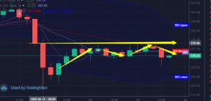 1小时来看,布林带整体还是在平行的震荡运行,同时有向上张口的迹象,价格K线先后几次刺破布林带上轨后,开始回落至234.5触底反弹,目前价格还在向上寻求突破,但是技术上MACD金叉开始缩量减缓,KDJ三线收口有聚合的迹象,短期看还有回踩的需求。