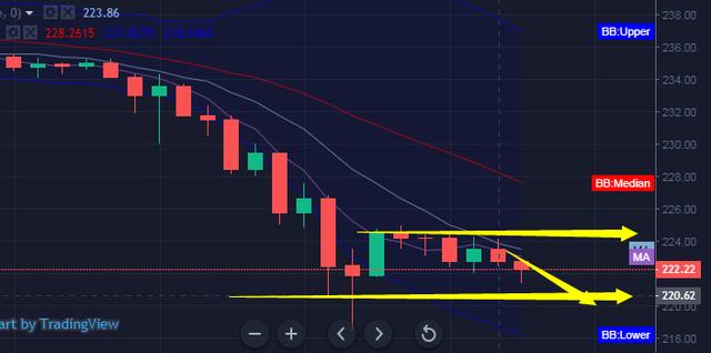 ETH目前走势在222附近运行,4小时级别走势在10日和30日均线下方运行,布林带向开口,走势依附布林带下轨运行,RSI指标向下,MACD快慢线死叉向下,综合来看,向下走势。