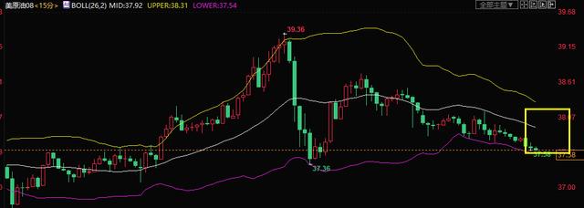 原油等了一天还是错过了行情没有入场,午夜震荡,昨天日线K线收取的看空信号,白盘震荡,上方短期压力关注15分钟BOLL上轨38-38.2一线。
