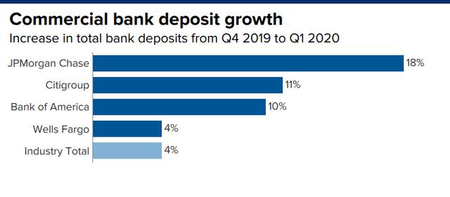从2019年第四季度至2020年第一季度,摩根大通、花旗、美国银行和富国银行的存款增幅如下: