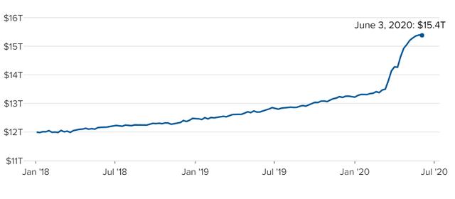 截至2020年6月3日的商业银行每周存款图表显示,存款增幅高达15.4万亿美元