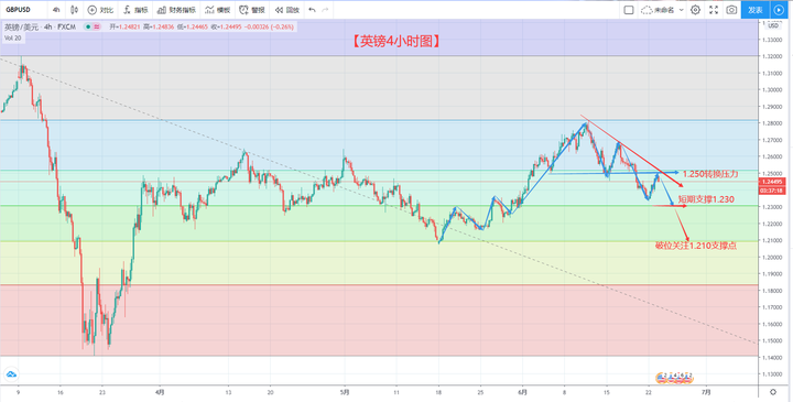 首先,美元在经历昨天的回撤之后,目前处于反弹阶段,但是能否进行突破97.8,是我们本次英镑空单交易的关键所在,如果美元顺利突破97.8这个点的压力,那么无疑将进行测试日线结构区间低点转换压力98.8,而英镑或将再次迎来新一轮的低点,甚至会再次回到1.200下方,但是如果美元再次于97.8承压,那么就不用多做解释了,英镑回落点1.230,则是我们本轮空单的初步离场点。