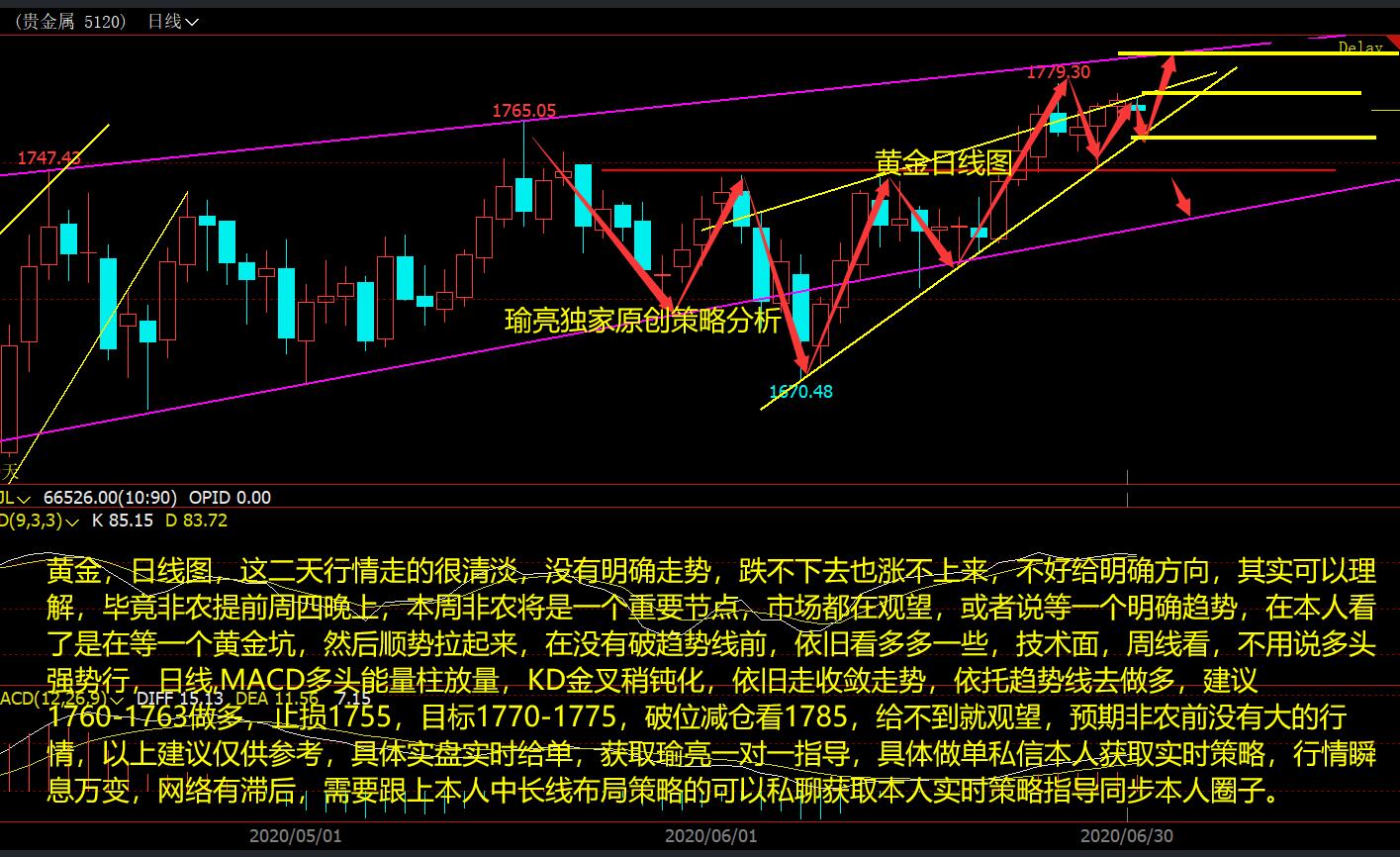 黄金,日线图,这二天行情走的很清淡,没有明确走势,跌不下去也涨不上来,不好给明确方向,其实可以理解,毕竟非农提前周四晚上,本周非农将是一个重要节点,市场都在观望,或者说等一个明确趋势,在本人看了是在等一个黄金坑,然后顺势拉起来,在没有破趋势线前,依旧看多多一些,技术面,周线看,不用说多头强势行,日线,MACD多头能量柱放量,KD金叉稍钝化,依旧走收敛走势,依托趋势线去做多,建议1760-1763做多,止损1755,目标1770-1775,破位减仓看1785,给不到就观望,预期非农前没有大的行情,以上建议仅供参考,具体实盘实时给单,获取瑜亮一对一指导,具体做单私信本人获取实时策略,行情瞬息万变,网络有滞后,需要跟上本人中长线布局策略的可以私聊获取本人实时策略指导同步本人圈子。