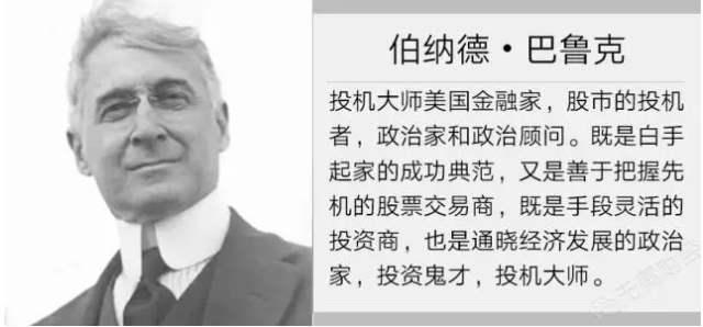 伯纳德·巴鲁克,1870年生于南卡罗莱纳州,纽约市立学院毕业,巴鲁克既是白手起家的成功典范,又是善于把握先机的股票交易商,既是手段灵活的投资商,也是通晓经济发展的政治家,投资鬼才,投机大师。