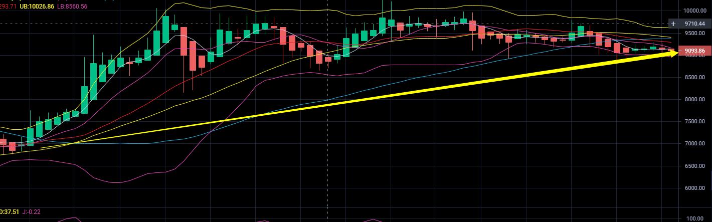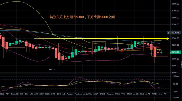 昨日大盘整体走来回震荡趋势,上下浮动100点左右,午夜时分,大盘大反转,一波下跌探底跌出布林带,直至跌到8942点位之后反弹,回到9000支撑位,目前币价处于9100附近进行盘整。