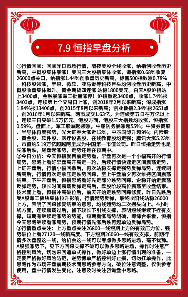 预计今日恒指走势偏强,美股收涨而且三大指数期货继续发力,港股ADR和夜期都有不错的表现。但恒指盘中能否突破阻力位26500点,还需要A股的持续发力带动。近日,中国证监会曝光258家场外配资平台,持续打击场外配资违法违规行为常态化,笔者认为有利于A股健康上行,同时也减少了港股跟着大涨大跌的几率。