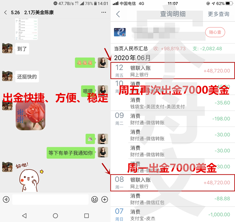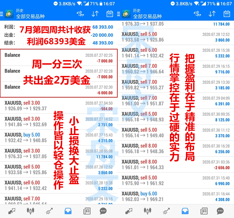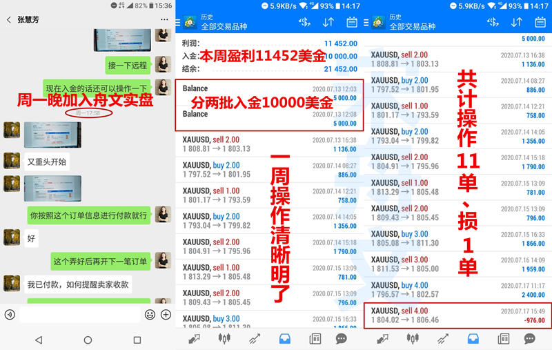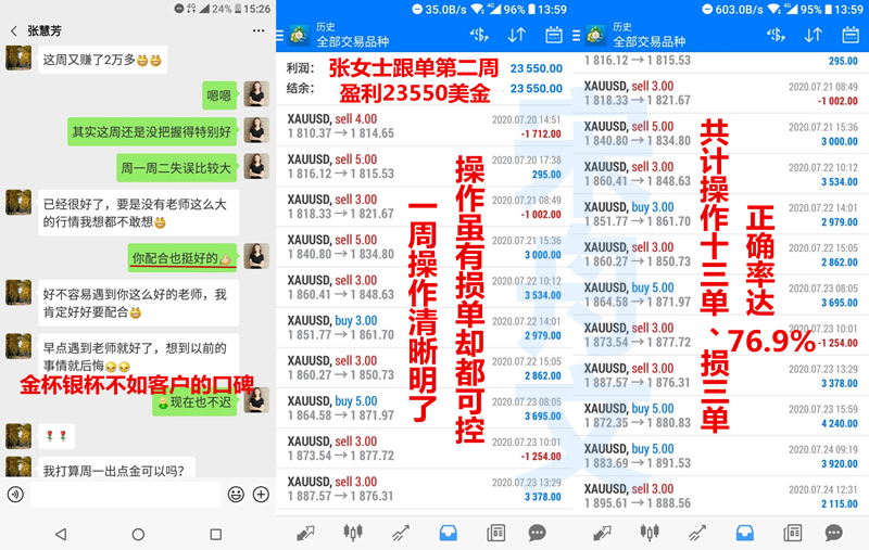 上周的行情就更加精彩了,虽说周一周二我们也曾操作不顺,但周尾三天我们奋起直追。功夫不负有心人,付出终有回报,经过三天的大行情,张女士资金再翻一倍,三万多美金收益足以证明实力。不要再说你在这个市场一直亏损,现货市场盈利并不是遥不可及,可能你亏损过,甚至是负债累累,但是,为什么别人能够赚钱?只是因为没找到方向,没有把握机会,难道你会认为自己就比别人差吗?这个市场最重要的就是你的选择。为什么舟文不怕你们之前的亏损,因为舟文会帮你双倍赚回来。