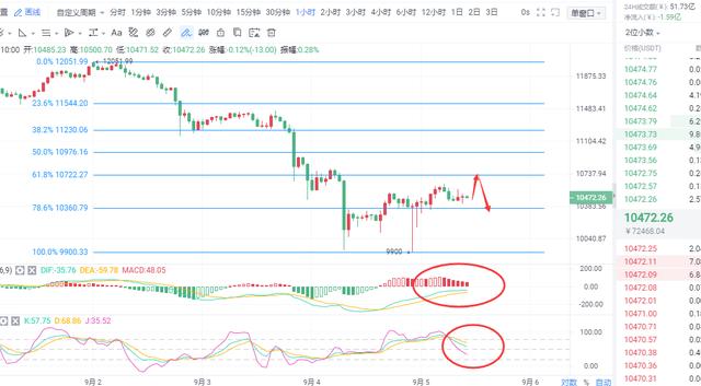 4小时看大饼价格前期两次插针探底9900附近,但是价格都是快速收上来,反弹也是很猛烈,说明抄底的人依然很多,目前价格在10500附近一线在震荡,尝试向上继续冲击,指标MACD死叉绿色动能持续缩量,KDJ三线向上拐头发展,今日白盘行情先看反弹。