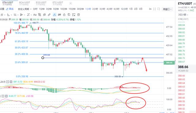 日线来看以太价格昨天再次延续跳水的行情,价格直接从上轨跌至下轨358后遭遇支撑,短期开始走反弹去试探中轨的压力,不破必然还会再次走跌,技术上MACD死叉绿色空头动能持续放量,KDJ三线向下张口发散,今日趋势上还是看空。