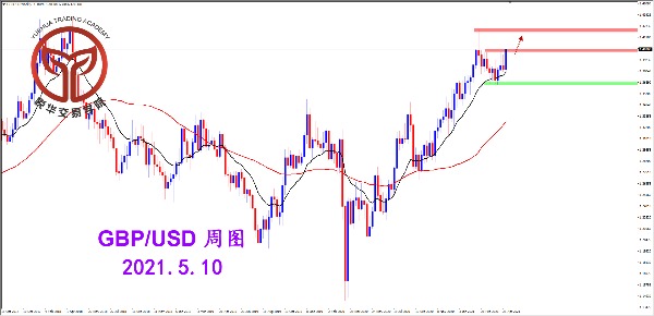 镑美周图,上周行情收出坚决大阳线,将要延续多头流向,有继续走强的机会,本周建议投资者关注可能的做多机会,目标位置看前期高点附近。