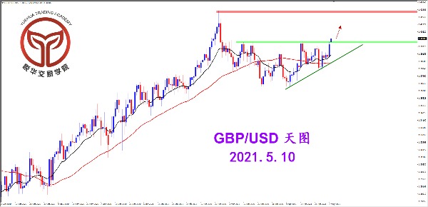 镑美天图,坚决阳线顶在压力位置附近,早盘开盘后有跳空迹象,多头占据主导,目前行情直接拉升,但在没有调整前我们无法直接追买,风险极大。