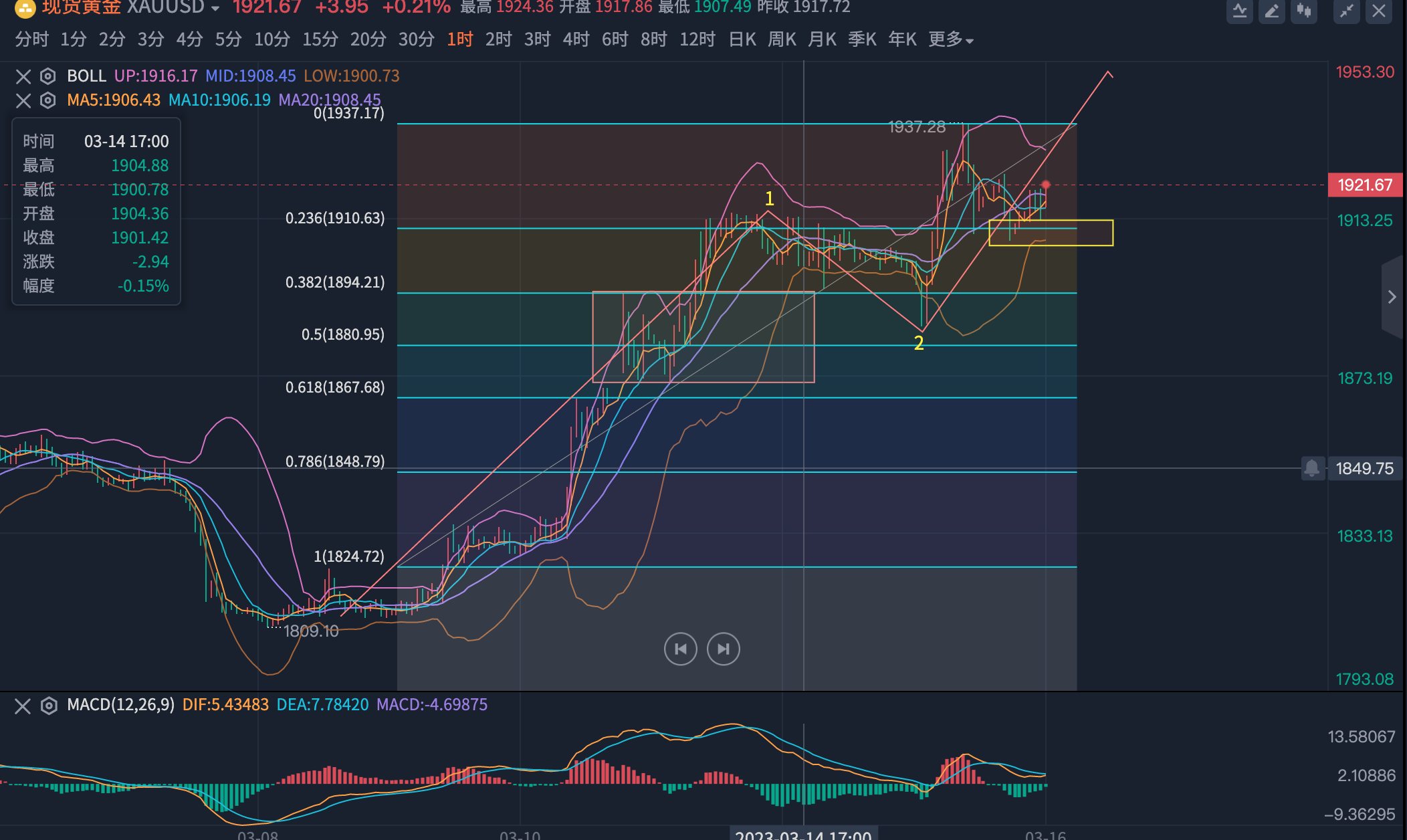 硅谷银行倒闭,瑞信紧随其后爆雷,欧美这一波信息的降临都会引起市场的动荡不安。黄金昨日回落之后反向上冲再次走高,在接连上行不能有效前行的情况下,周三出现回撤表现,但是随着市场消息面的影响,避险增加黄金再次重拾多头回归上行延续形态。技术上,短期结构依旧较为明显的涨势结构,从1826这波上涨至1914我们可以视为第一浪上涨,1914回踩确认位1886为第二浪回调浪,1886此位形成多空分水岭,不破多头结构不破坏。日内的话还是维持短线回调继续做多思路看大三浪涨势,目前行情在1小时布林轨道中轨反复震荡不做参与,稳健的话等到触及下轨1910-08位置去做参与,持续冲高高位不易追进,等待合适进场位,下一道支撑位置关注黄金分割线(0.382)1893-95企稳继续多。综上所诉,日内回踩跟多为主。黄金操作建议:1910-1908做多,止损6美金。目标看1925-1933,破位持有!