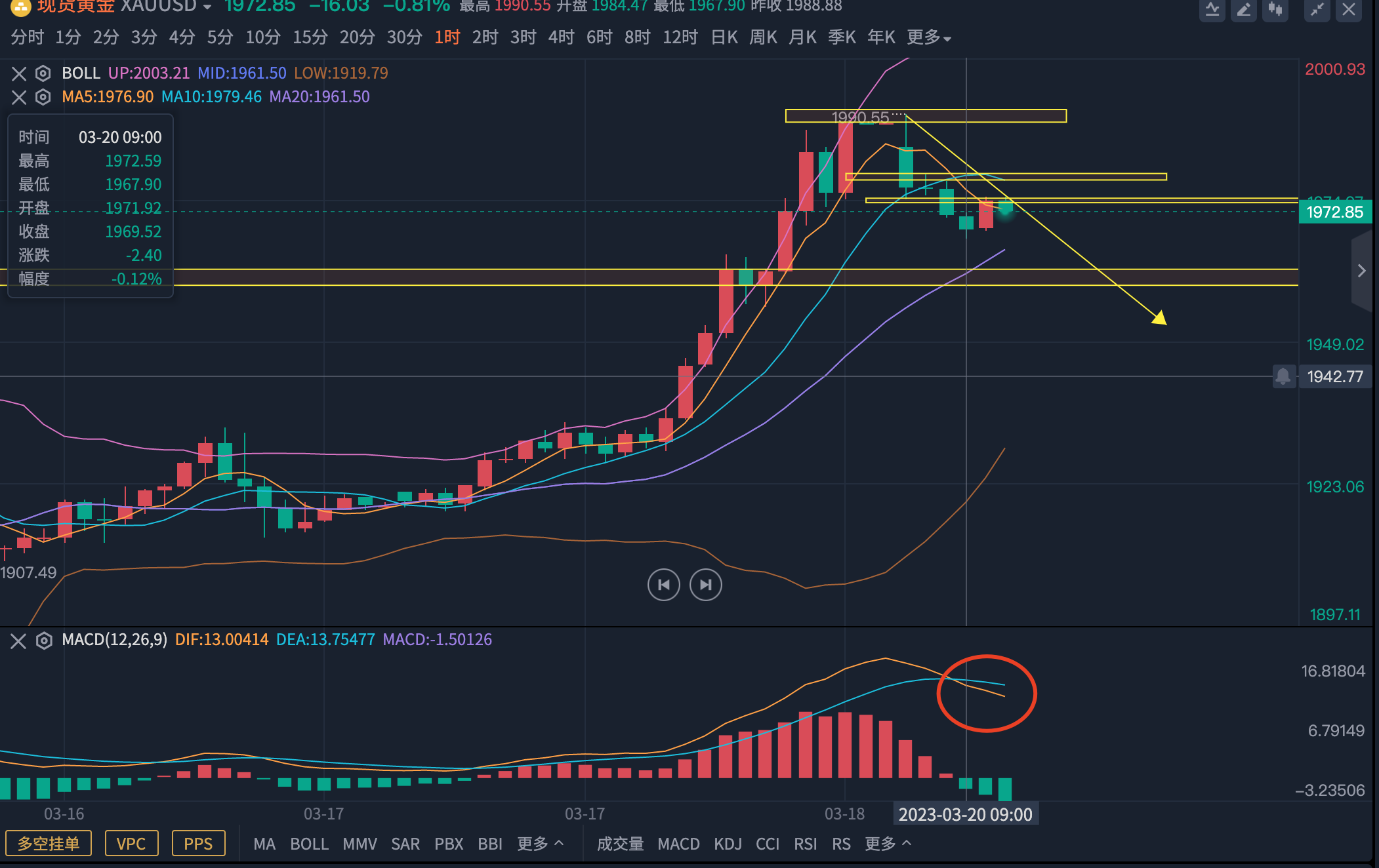 3.17周五录得一根大阳k线。也是达到了鑫顺当天全网看新高的预期。今日黄金走势技术上周初先看调整修复,目前小时macd超买指标死叉向下运行,早盘5日均线下相继承压。先是1978-79承压,目前1975此处反复承压明显。高点给了1990-1979-1975三个短期阶段。4小时图来看的话布林轨道中轨偏离较远有修复需求。操作上我们可以依托小时图5日均线给到的压力位1974-75附近做空及时上车,前高1960看欧盘能否达到延续下破,下破空间可看到1950-1940这些位置。4小时k线图1990双顶压力,5日均线已经刺破,下一道考验的支撑位就对应在10日均线的位置就在1950。亚盘1975附近能承压持稳回不到1980上方的话欧盘1960增大破位概率!综上所述,大方向多头格局不变,周初稳健操作先看修复调整。1974-75附近做空,破1980止损,目标1965破位看1960.此位首次触及预计会有反弹!
