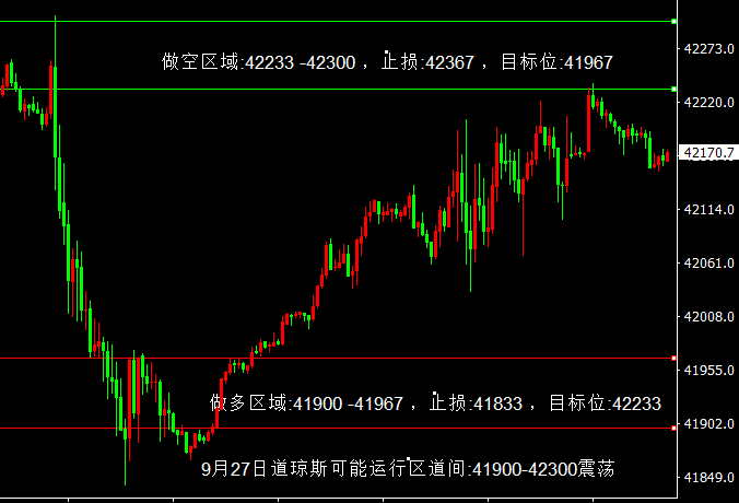 做空区域:42233 -42300 ,止损:42367 ,目标位:41967