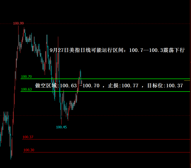 做空区域:100.63 -100.70 ,止损:100.77 ,目标位:100.37