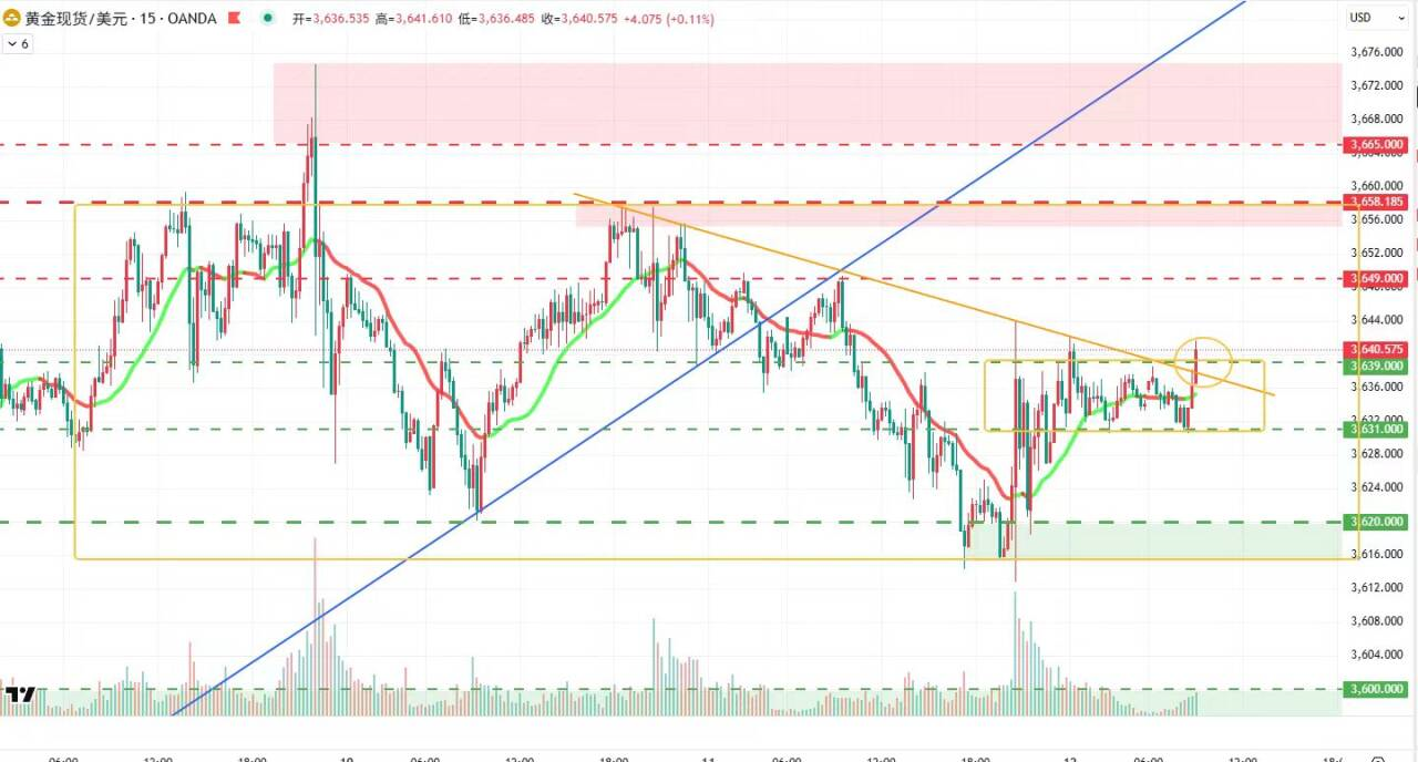 后半夜以来震荡局限于3631-39/44,亚盘正在测试上沿,自周三以来的下行趋势线在上沿重合,如果有比较强的阳线破位(至少15分收线,确认需1H收线),可能短线转为多头去看55-58,否则还是在小震荡之内略偏弱势,可能继续测31并在破位后重测15-20。