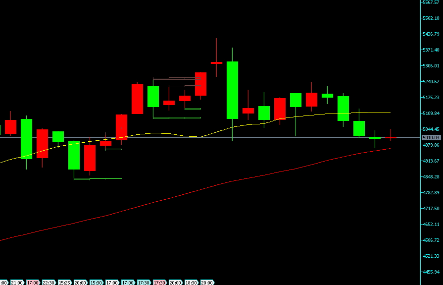 日线昨日录得十字星形态K线,MACD指标双线仍处于死叉运行过程当中,暗示回调过程或仍未结束。日图PP枢轴点位于5003.83附近,当前价格运行于枢轴点上方。
