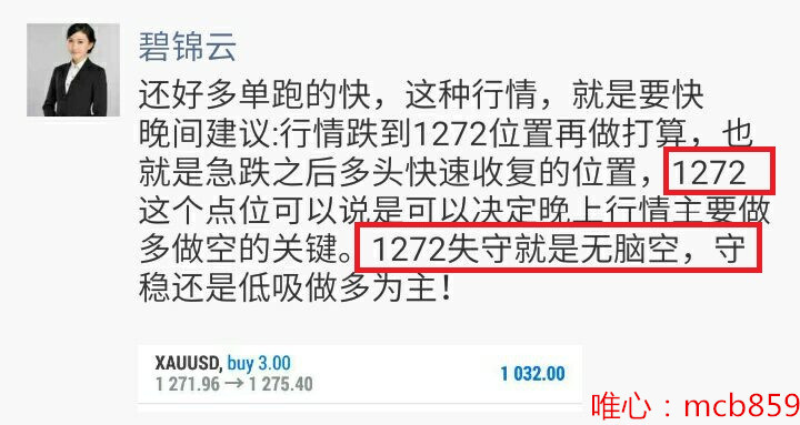 第一单:早间9:30在1276位置空单进场。止损1280,目标位:1273-1272,在1275附近提醒继续持仓。砸盘很给力,目标位到达,完美止盈